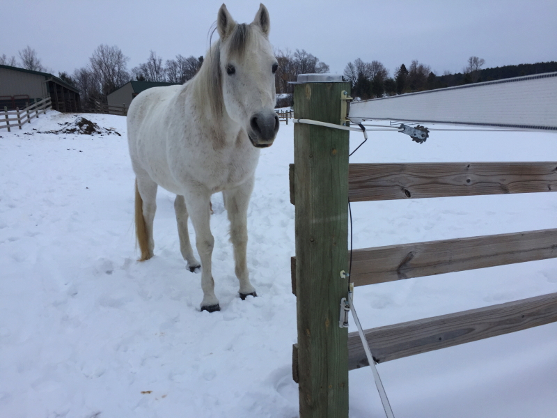 When I got up to the house after feeding the horses, I realized I’d forgotten to test the electricity on the fences.