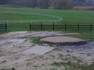 We have received a steady rain for about 20 hours. Steady is good, because we don’t get it all at once and suffer all the problems of instant rivers of runoff, but the freshly moved lyme screenings are like wet cement. If the horses walk on it now, it will make a big mess.