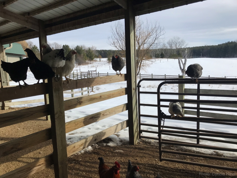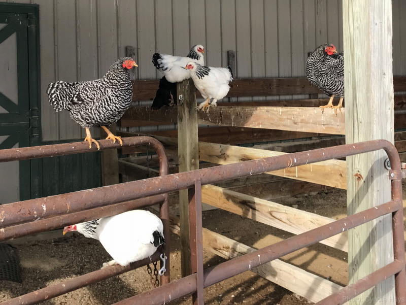 Yesterday, Cyndie happened upon the chickens roosting on the fence and gate under the overhang of the barn. It’s great to see them making themselves at home in the protected spaces we are able to provide.