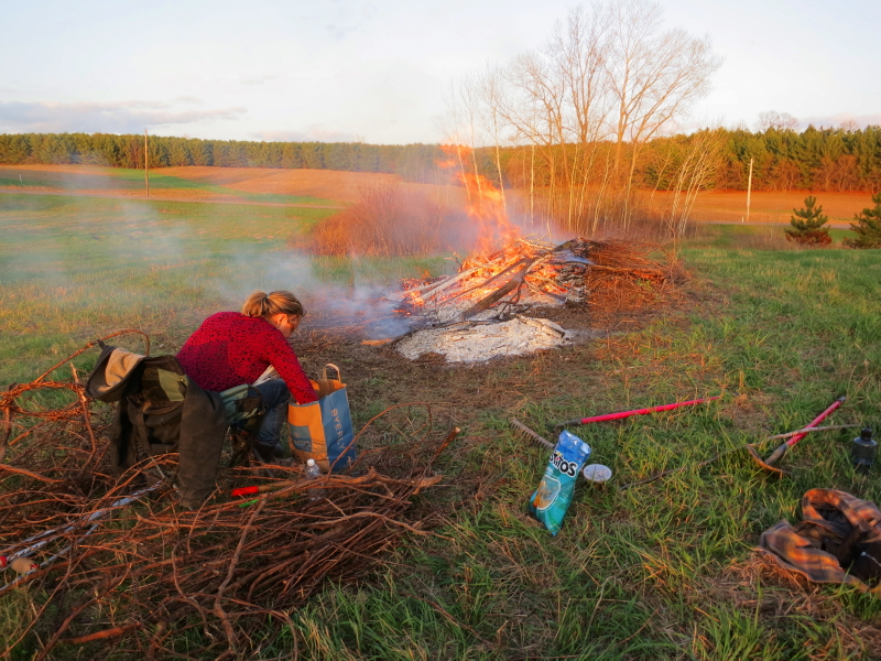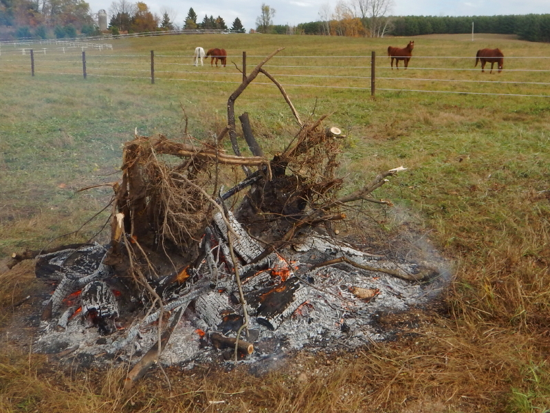 It rained Sunday night, but that didn’t stop me from reigniting the brush pile yesterday afternoon. It is a fascinating exercise to witness the ebb and flow of fire energy, as it slowly, but surely consumes tree root bundles. You can’t leave it untended, if you want to make constant progress. There is just too much moisture stored in the roots, and they don’t really want to burn. You need to keep feeding the fire wood that is dry enough to burn well, and stoke those coals to keep them glowing red-hot.