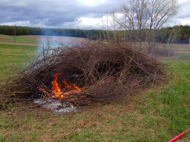 It is that time of year again when piles of brush get burned into oblivion. This pile was on the top of the hill on the north side of our driveway. There was a moderate collection of fair-sized branches that had been there since before we arrived. A couple of days ago, I tossed on some cuttings I recently cleared that were leftover from when I mowed this area last fall.