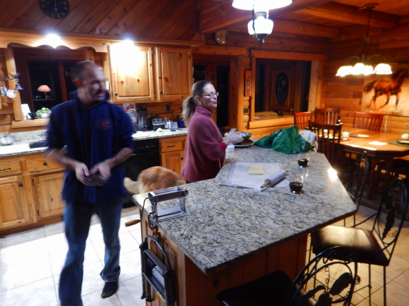 Last night we chose indoor recreation, with a wonderful fire to make it extra warm and cozy. Cyndie had designs on making chicken parmesan, and talked George into bringing his pasta machine over. He showed up with that, and more. Can you say, “homemade ice cream?”