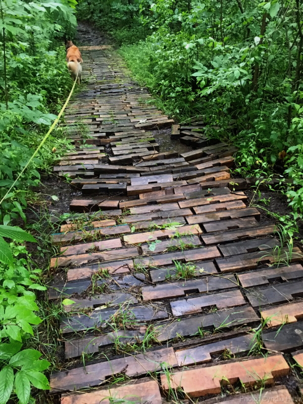 Surveying our woods after things calmed down yesterday, Cyndie found the boardwalk we created suffered some disruption.
