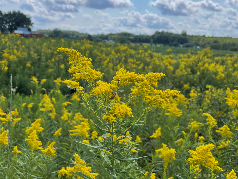 The next noteworthy thing that caught our attention was the incredible buzzing sounds of a striking number of bees busy in the yellow flowering tops of goldenrod beside one of our trails.