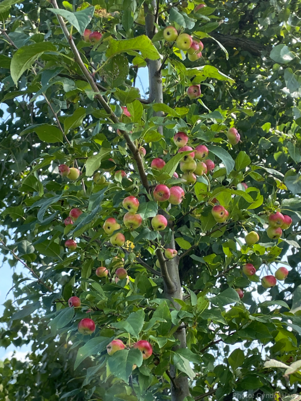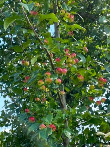 Not far down that same trail, we made another surprising discovery. Tucked behind a large viburnum nannyberry bush was a volunteer apple tree with an impressive amount of fruit on its limbs. It’s the first time I noticed it, which is surprising because we usually pay a lot of attention to the volunteer trees showing up beside our trails.