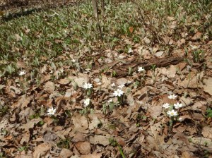 There are a small number of native trillium plants that appear during the relatively short flowering weeks in a handful of spots in our woods. Still, they have yet to offer a hint of becoming the striking carpet of coverage like we see up at the lake.