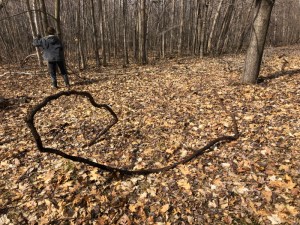 What started as a typical walk through the woods with Asher yesterday afternoon suddenly shifted on a whim to become an industrious “de-vining” effort. Because it is easy to navigate off the beaten paths this time of year, I frequently allow Asher to wander wherever his nose takes him. Sometimes he turns me around enough that I lose my bearings. Asher can bring me to spots where I’ve never stood before.