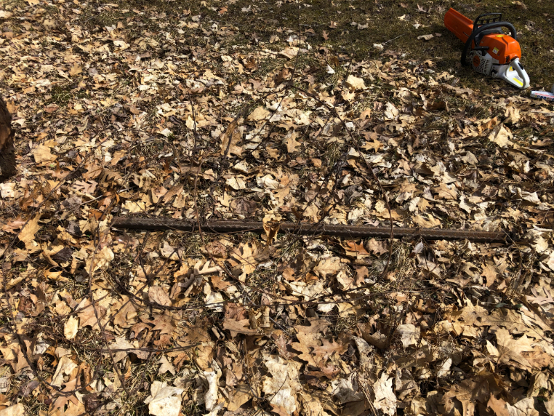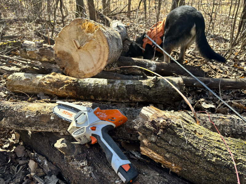With our continued dry weather and the forest as dormant as ever, each time we walk around in there I spot another vine to be removed from smothering one of our trees. Cutting down vines takes a lot less effort since I can easily hand-carry the trusty Stihl mini chainsaw on walks with Asher.