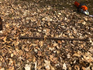 It’s been over two weeks since Asher and I discovered a fallen tree leaning across one of our trails in the woods. At the time, Cyndie was in Florida and I needed to wait for her to get home before bringing out the big chainsaw –a tool I’ve agreed to never use when home alone– to clear the path.