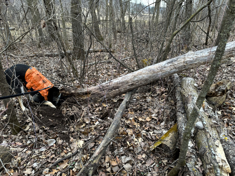 I had tethered Asher to a nearby tree while I worked to find as many of the aggressive tree-climbing troublemakers in sight. Upon exhausting myself of the effort and returning to collect him, I found Asher gnawing on a bone he had found near a large hole he had dug.