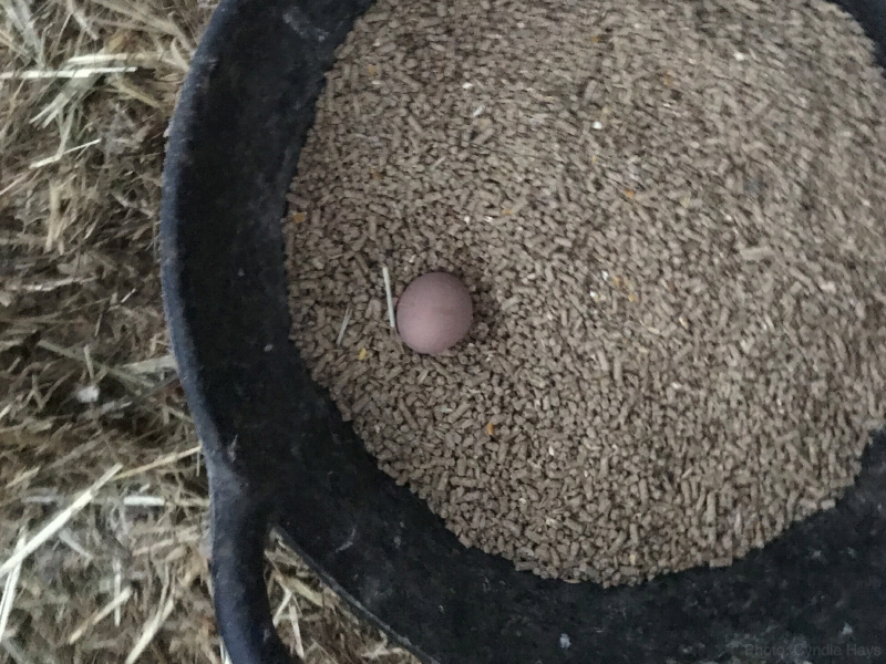 Yesterday, Cyndie discovered one of the layers hasn’t figured out the nest box routine and was laying eggs in the sand of the far corner below the poop board, where visibility is restricted.