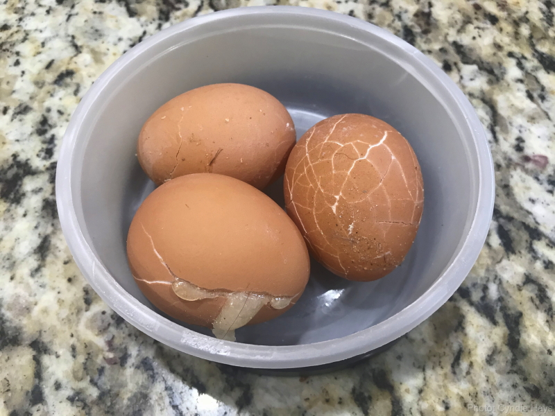As Cyndie multitasked yesterday to walk Delilah, collect the emptied trash and recycling bins, and collect eggs from the coop, she was suddenly met with —