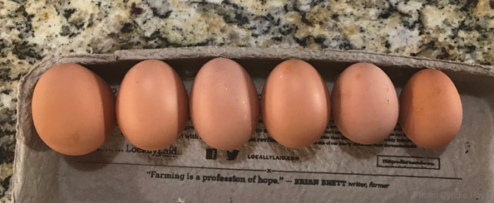As of yesterday, we hadn’t yet made the transition to using egg cartons when collecting eggs. When it is only one or two eggs, both Cyndie and I tend to slip them into pockets for the trip back up to the house. Once we start finding a half-dozen or more at one time, our stash of old egg cartons definitely comes into play.