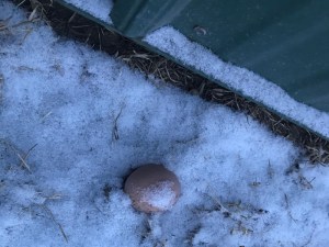 There was a single frozen egg discovered this morning next to the wall of the barn. Oops.