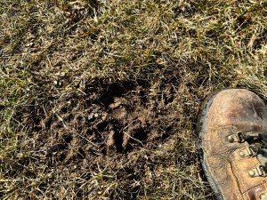 In areas where there is no grass, like around my piles of composting manure, I ran into a different challenge. The black dirt looks solid enough, but I am well aware it will be slippery so I step carefully. My boots didn’t sink in, so things seemed tolerable. However, it got messy real fast when I picked up a foot and discovered that the thawed top 1 centimeter was staying attached to the soles of my boots.