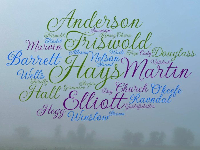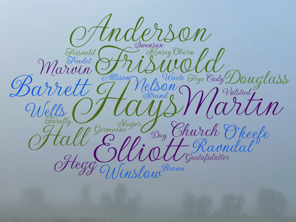 The name Hays occurs 5 times but there are only 4 Friswolds because that name changed from Frisvold four generations back. Cyndie’s mother’s and my mother’s maiden names show up 4 times each.