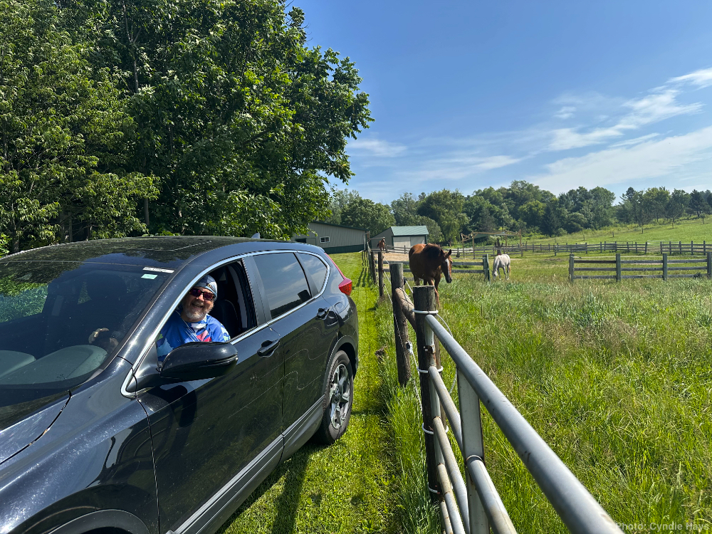 While Cyndie was closing gates after I had driven her car through, she took a picture of Mia coming over to see what the heck we were up to.