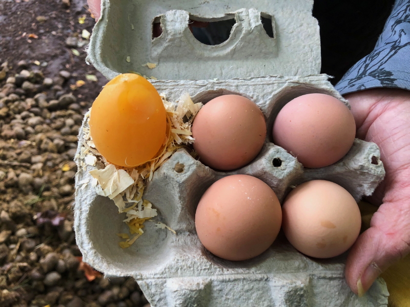 I have finally seen the first egg laid without a shell. On Monday, Cyndie came from collecting eggs at the coop and showed me the crazy thing. The shell-less membrane was sturdy enough to be gently handled without rupturing, and as visible in the image, looked full-sized and held the shape of a regular egg.