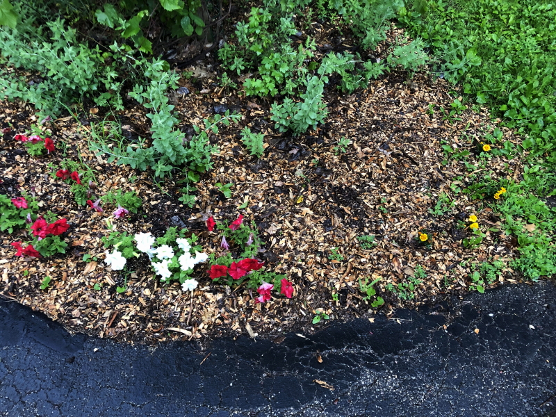 It reminds me of the decorative flowers Cyndie planted around the grounds. The petunias appear to be perfectly happy, but the marigolds haven’t changed since they were put in our soil. Maybe the marigolds were old.