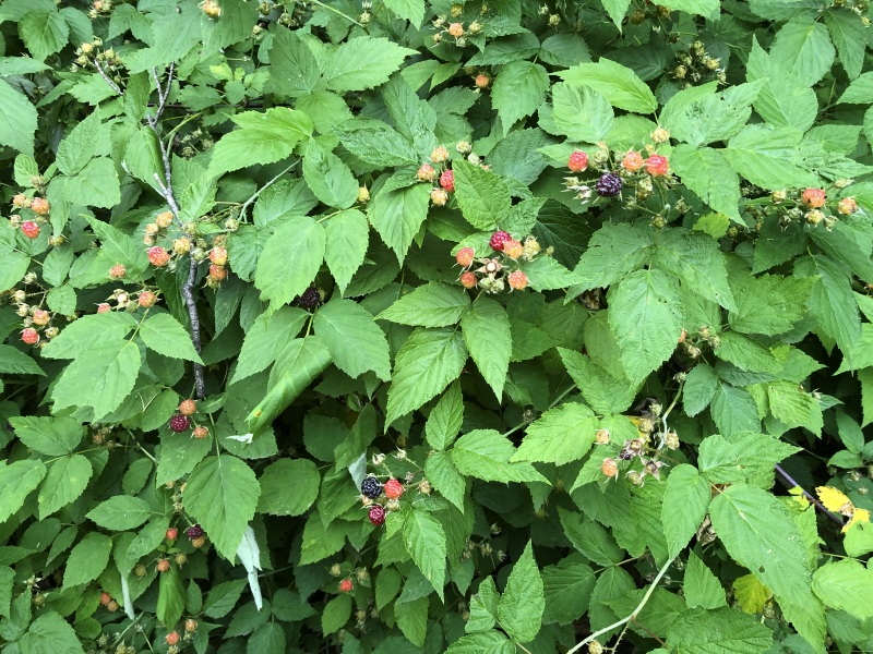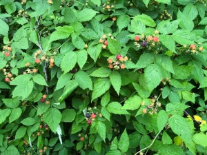 Just as soon as I go spouting off about there being few raspberries on our bushes, I discover that I was wrong. While mowing the lawn yesterday afternoon, I noticed the potential bounty that Cyndie was referring to the other day. Closer inspection revealed a good number of future berry blossoms developing on bushes in a variety of locations around the yard.