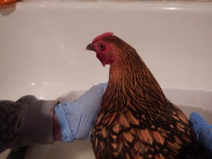 So much for letting nature take its course. Cyndie decided to try a little intervention on our ailing Wyandotte. Looking up the hen’s symptoms online pointed to the possibility of her being egg bound. That meant a trip to purchase some supplies and then redecorating the downstairs bathroom into a triage and recovery center.