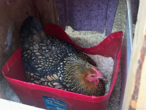 Later in the evening, after Cyndie returned from closing the coop, she had this to report: As usual, there was a hen squeezed onto the 2×4 over the side window, but this time, it was one of the Australorps. That top perch is usually claimed by one of the Wyandottes.
