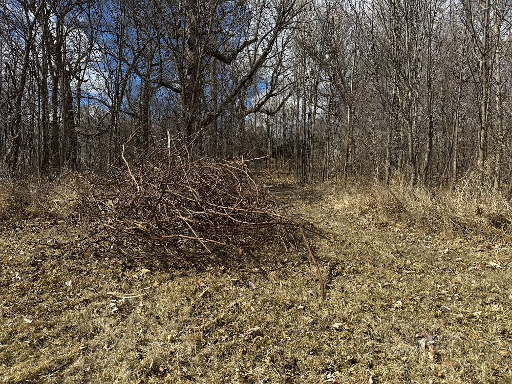 Anywhere on our property that we don’t regularly walk through is pretty much guaranteed to have grape vines seeking to become the dominant species, bending branches and entire trees down into submission. Trying to keep them at bay could be a full-time job. I yanked as many strands as possible from the branches of the bushes that were being swallowed and made a pile of vines.