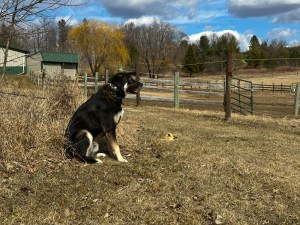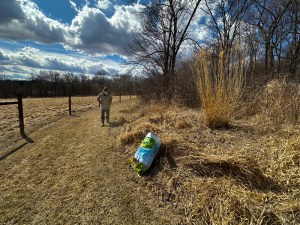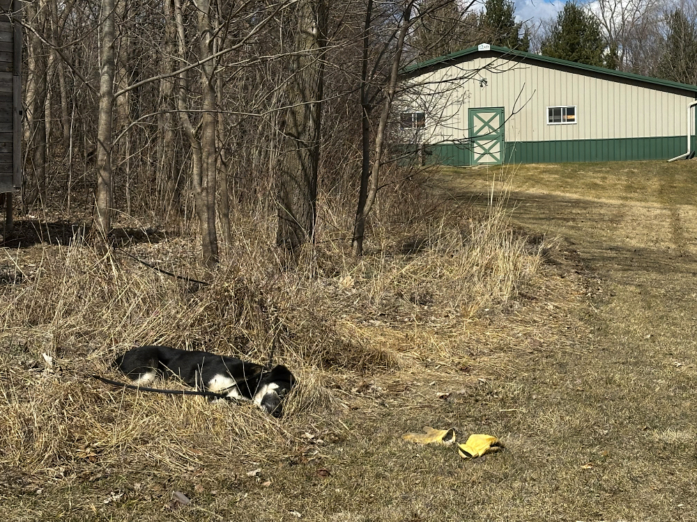 The hope is to turn just a select strip into a miniature moonscape. Since this method kills everything beneath the plastic, it’s not different from spraying entire swaths with a solution of vinegar/salt/dish soap concoctions, so we may experiment with that in a different location. Cyndie donned protective gear and worked to cut out the woody stems of poison ivy with berries that are very easily seen right now. She left her good gloves behind with Asher to stand guard.