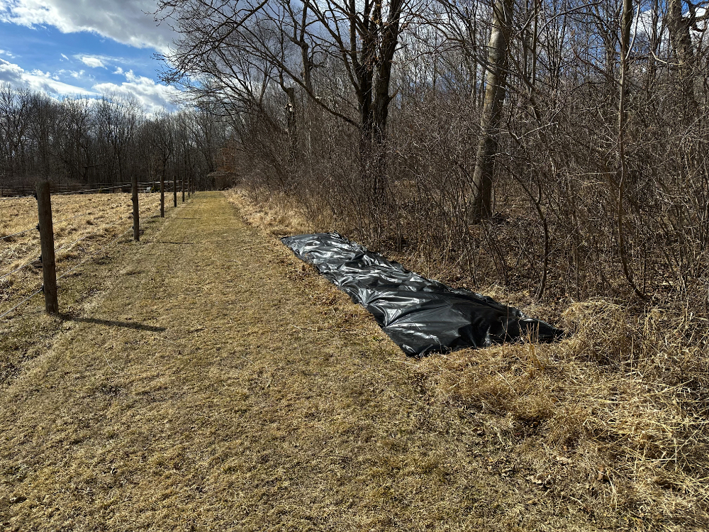 Sure, we could get goats to control the patches of poison ivy on our land, but we don’t need large swaths eaten down to a moonscape. We want a more targeted approach and one that will cost us less than goats. We are taking a shot at using plastic and/or cardboard to cover specific patches where the problem plant is most entrenched.