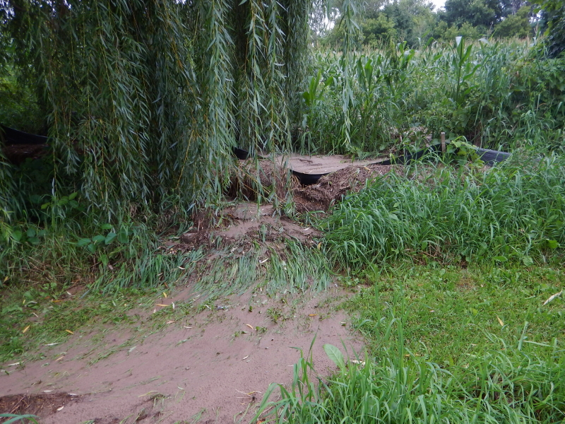 Our attempt to stem the tide of topsoil flowing from the neighbor’s cornfield came up short of successful after not very many storms. I don’t know if there is a more industrial version of a silt fence or we just need to pull out and re-install the one we have, above the new ground level.