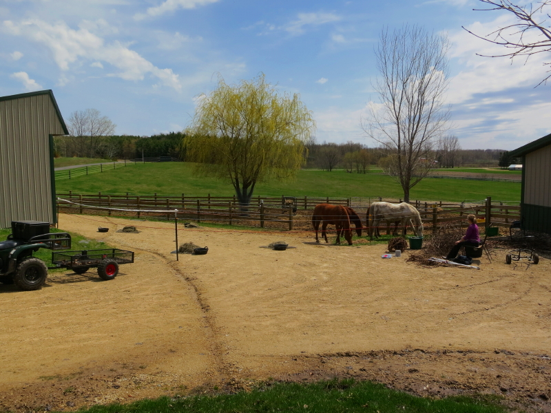 On Saturday we took steps to provide our horses access to some dry ground by stringing temporary electric fence around a section of the gravel drive between the barn and the hay shed. As you can see in the image, they were most enthralled by the small area of green grass that was available in one small corner.
