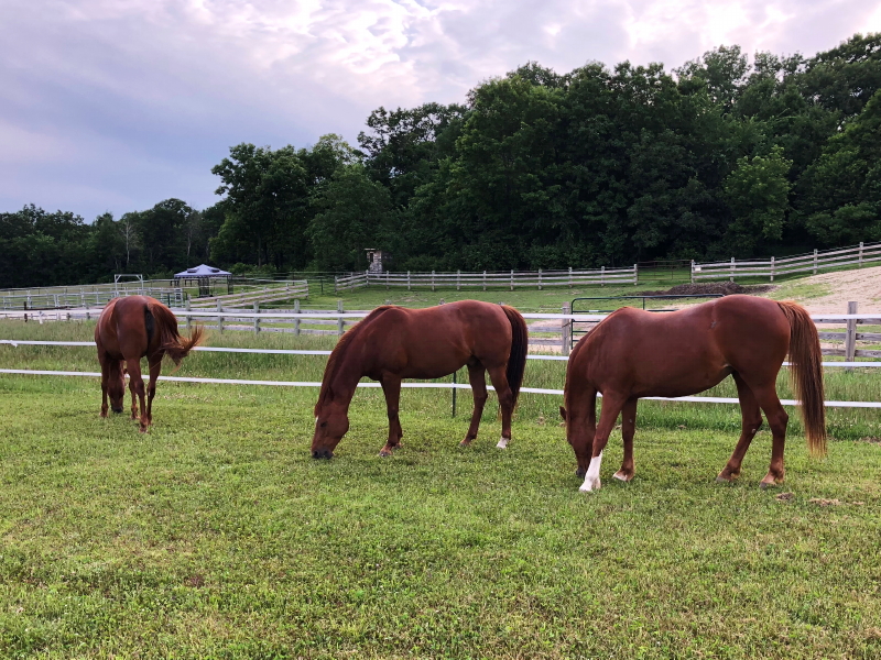 Just before sunset last night, we let the horses have a few minutes to graze on the mowed arena space. They were thrilled with the opportunity.