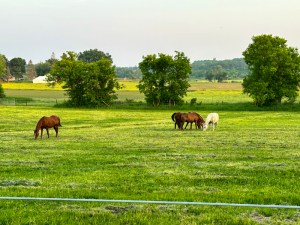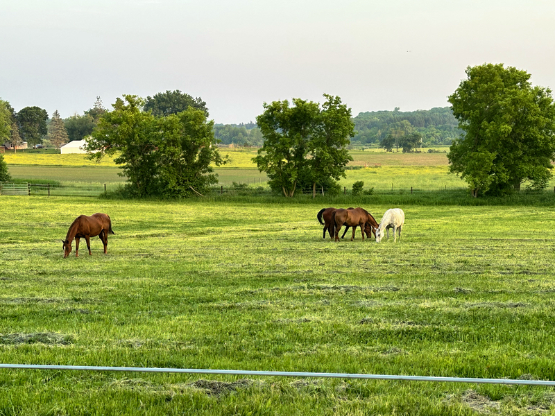 Yesterday, Cyndie gave the horses a new first by opening the gate to the front hayfield for them to explore. The four of them have already chomped the back pasture grass down so much we need to give it a rest.