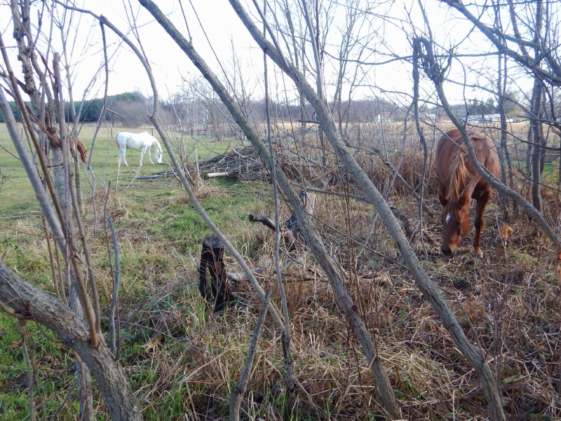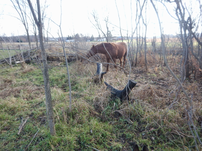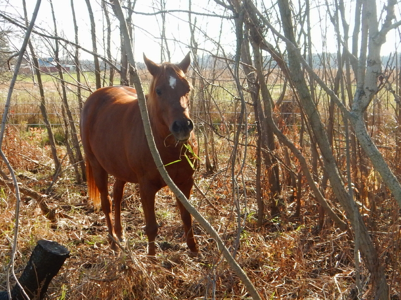 I strolled down to the portion of our back pasture where we have preserved an area of tree growth. With the usual thick foliage gone for the season, I could better see how much horse activity goes on among the trees. The herd followed close behind, with Cayenne roaming right into the thick of it to show me how she seeks out the best bites that grow in hard to reach places.