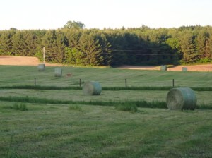 The cut hay in our fields was raked and round-baled on the same afternoon yesterday. If you look close, Cyndie captured a lone deer crossing the image view as the field became draped in the shadow that was replacing the disappearing sunlight.