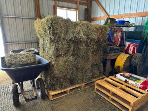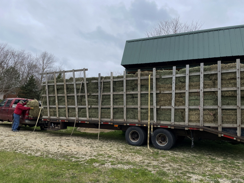 One of the best parts of our relationship with This Old Horse is that they provide all the support needed to care for the horses, and the greatest relief for us is that we don’t have to find and transport baled hay. Yesterday was magical in that a trailer full of small squares was delivered right to our hay-shed door.