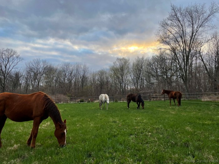 Meanwhile, our horses have the back pasture for grazing. Yesterday evening, Delilah and I wandered out into the pasture to pull some weeds and the herd showed up to munch nearby.