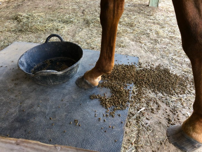 Of the four horses, Light is the most prone to stepping into her feed pan, often tipping it rapidly and spilling the contents. In attempt to avoid them trying to eat the spillage out of the sand, which is not good for their gut, we have tried serving Light’s pan on a rubber mat.