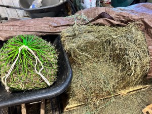 Once the wagon was empty, we swept up a full wheelbarrow of loose scraps that had fallen from bales. Cyndie then included a mix of those scraps along with the old hay in the nets she topped off when we served up the horses’ evening feed buckets.