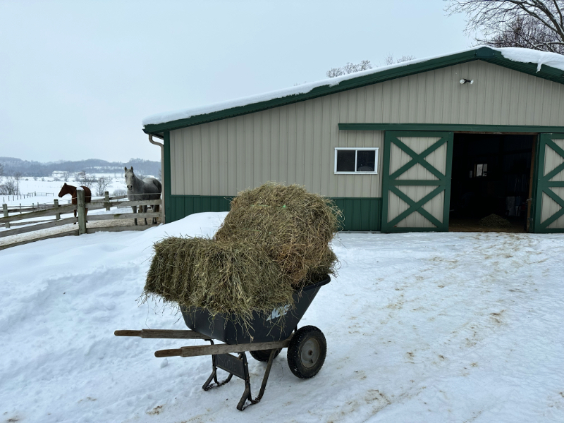 We tossed and restacked 150 bales from the hay wagon to the shed, and I didn’t notice a single bale that looked odd. One thing Cyndie and I have learned over the years is that our impression of hay being “good” doesn’t amount to a hill of beans if the horses don’t like it. That would prove to be the ultimate test.