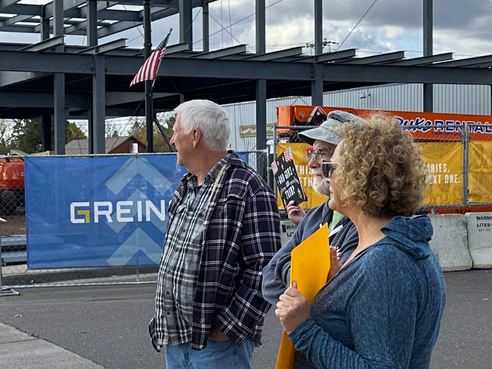 When we arrived at a spot to park our car, there was no hint of any atypical activity anywhere. Undaunted, Cyndie was ready to forge ahead no matter what. Then a car pulled up with two women who asked if we were there for the protest. That made four of us, and we walked to the corner and stood tall with signs, quickly receiving supportive honks from passersby.
