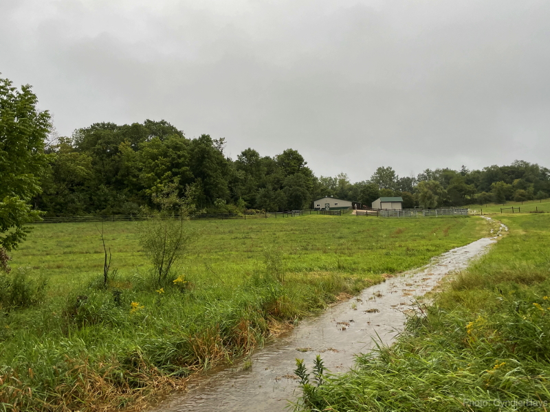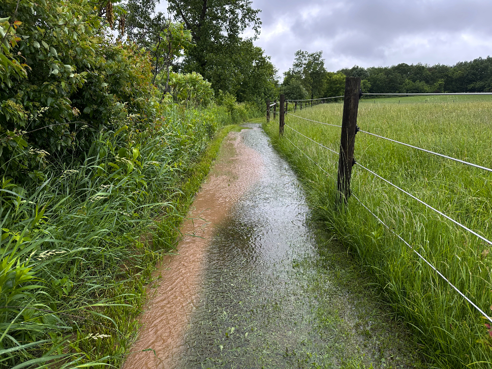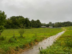 The drainage swale across our back pasture was flowing like a river. The ditch that runs along our southern border looked like an even bigger river. I am very pleased to have just knocked down the tall growth along the center of that ditch only a few days before, allowing the flow to proceed unhindered.