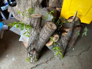 Speaking of willow trees, I saved a piece from the large section that came down recently because it looked like it had potential for carving a heart shape. I set it in the shop garage to dry out next to several other hunks of wood saved for future projects.
