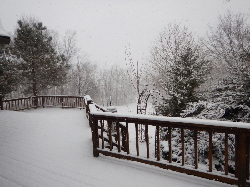 Then the wind started to increase. That makes a big difference in any weather event. Wind takes everything up a few notches of intensity. It continued to snow, and the wind howled intensely, all night long. By morning we had 8 inches piled on the deck railing, in the small section blocked from the harshest gusts.