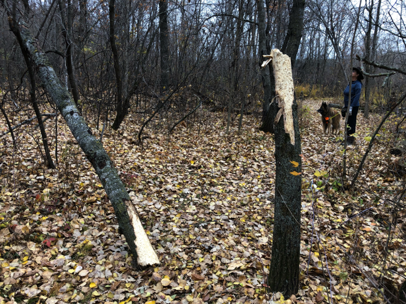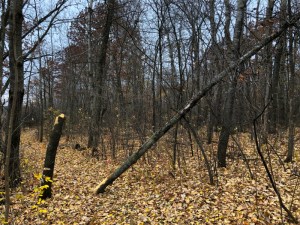 Maybe the portion of the trunk that had been chewed up by some scavenger became the weak spot, as it snapped off right in the middle of that gaping wound. Regardless, the upper portion is caught in other trees and will need to be dealt with using the chainsaw.