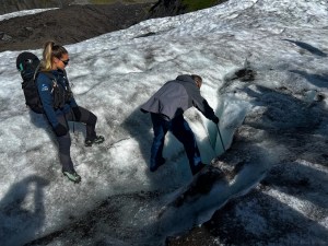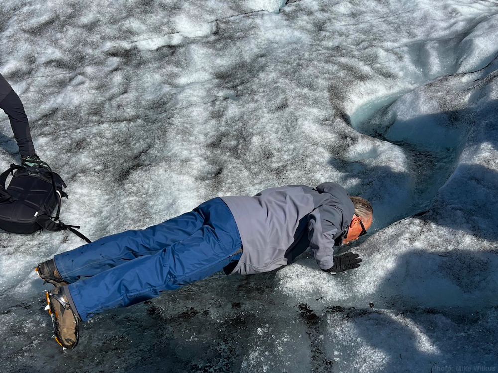 Our guide explained that melt water is safe to drink, but it “must be done” by a prone position with our hands on an ice axe. She positioned her axe and demonstrated the pushup position technique before giving us all a chance to try it.