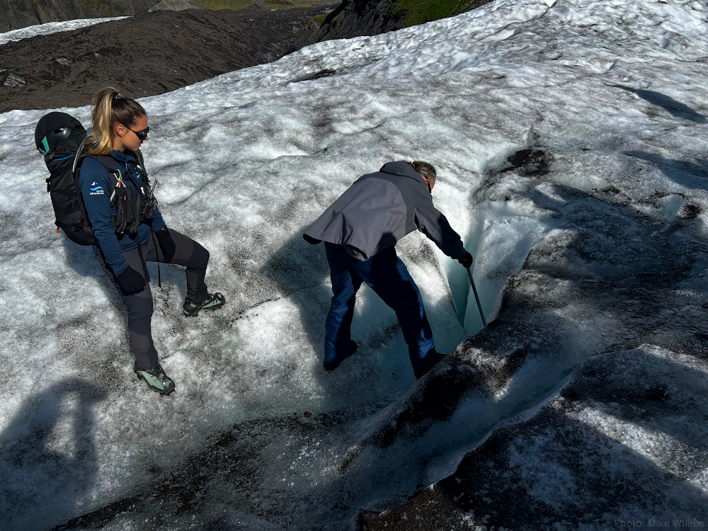 Our guide parked us for a moment so she could check on a crevasse to ensure it was still safe enough for us to approach. The height we were allowed to climb on this finger of the glacier was limited to below where serious crevasses were forming.