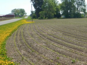 On one side of the road there were rows of sprouting shoots of corn plants.