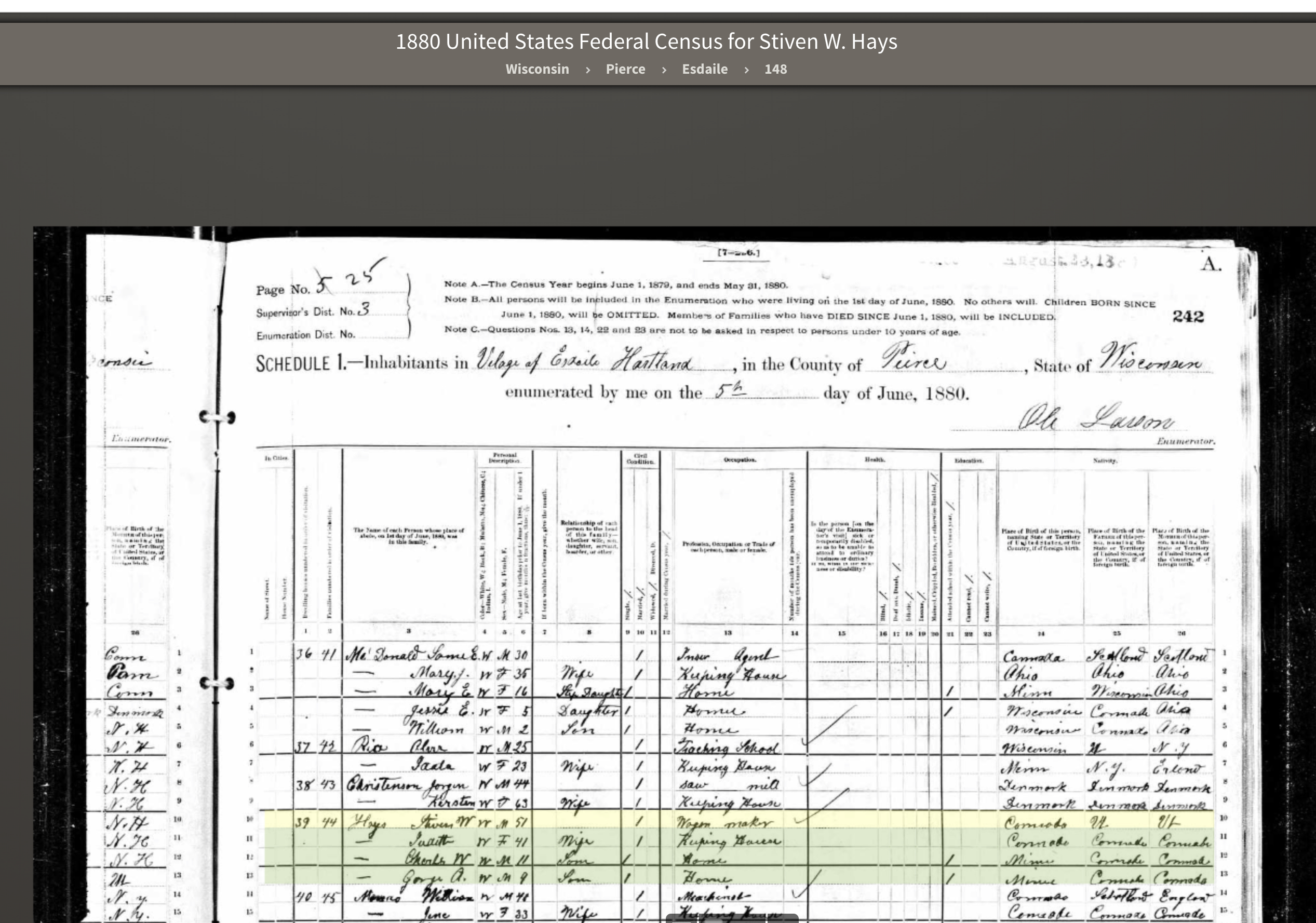 The Hays family of Stephen and Judith and two of their sons are counted on the pages for Esdaile, Wisconsin. I was stunned to find this previously-unknown-to-me community is on the equivalence of 650th Street just about 13 miles south of our current home. Our driveway is also on 650th Street, which is an amazing bit of synchronicity and surprisingly close, in my opinion.
