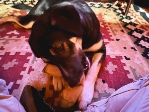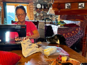 In the afternoon, Cyndie occupied herself in the recliner by making a “snuffle mat” for Asher. My sister, Judy provided inspiration with photos of mats that she makes. The project fit well with the homemade dog chews Cyndie had just sewn for our pup.